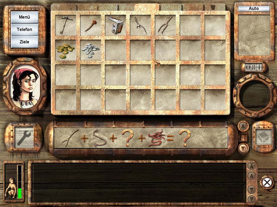 Gameplay: Man strandet auf einer geheimnisvollen Insel und muss sich erstmal selber versorgen, was trinken, was essen u.s.w. Nebenbei findet man überall Gegenstände, die man alle in sein (riesiges) Inventar packt. Bis jetzt habe ich so um die 30 Gegenstände gefunden. Von Spitzhacke über Gold -, Silbermünzen, Stroh, Ton, Orangen, Zitronen, Metallgabel, Würmer ... Manche kann man natürlich kombinieren und damit neue herstellen - klingt einfach aber bei Gegenständen wie Holundermark oder Seehundfett kommt man doch ganz schön ins Grübeln was man damit eigentlich tun soll/kann.