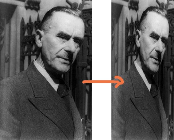 Hinweis 4 Thomas Mann (gestreckt, gezerrt, halbiert...) --> toll, der Mann ist erkannt, gut. Links ist er normal dargestellt. Ist er rechts dick, oder ....?