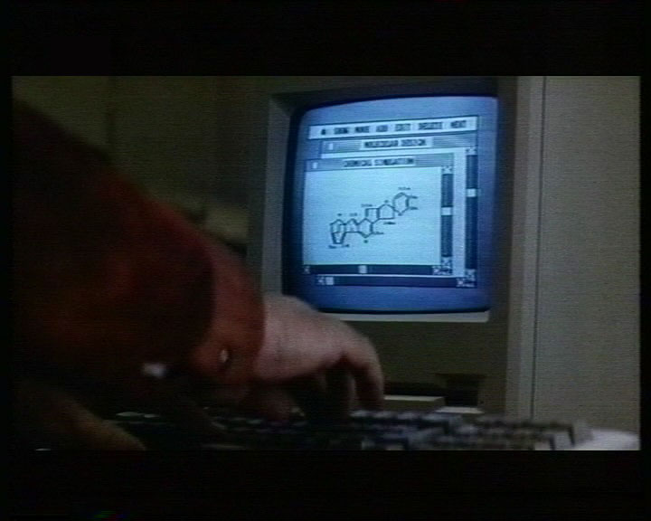 Ui, das ist schwierig. Vor allem ohne sichtbaren Schauspieler. Sieht auf jeden Fall wie ein altes Videoband aus. Ebenso ziemlich alte GUI-Optik auf dem Bildschirm. Chemische Formel vielleicht. Sie als nach 'nem Agenten-Thriller oder so was aus der Richtung aus; aber da hört mein Latein auf.
