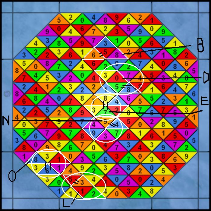Auf dem Mosaik suchte ich mir die Zahlen, welche um eine Farbe des Buchstabens gehören könnten. Da laut dem Teller immer drei Dreiecke nebeneinander ein } ergeben, bin ich zum unten aufgeführten Ansatz gekommen, welcher aber noch nicht vollständig ist und vieleicht auch falsch. Der einfachste zum Suchen auf dem Mosaik ist die > I ( ist in der viertuntersten Linie linkerhand zu finden)