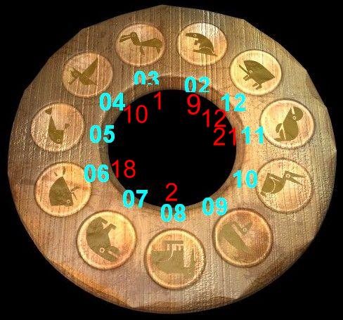 Locutus und ich haben die Zahlen von den Goldenen Plätchen(Tyrkis) und die bisher Übersetzten Zahlen(Rot) in den Ring eingefügt um eventuell was zu sehen .