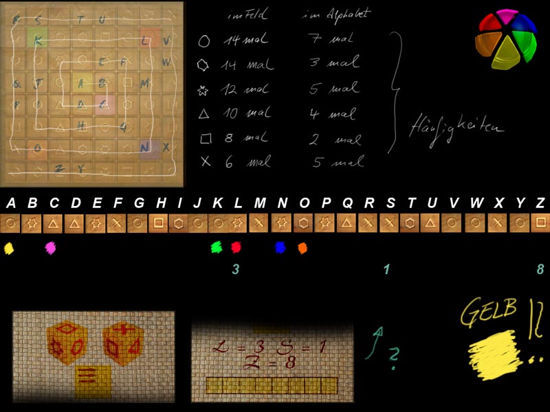 Zwischen den auf der Bastmatte stehenden Buchstaben sind immer Sechs weitere (zwischen L und S und zwischen S und Z), genau soviele Seiten hat ein Würfel... Was das bringt weiss ich aber auch noch nicht.. genausowenig, wie dass die Glasscherben die selben Farben haben, die hiewr ständig auftauchen.