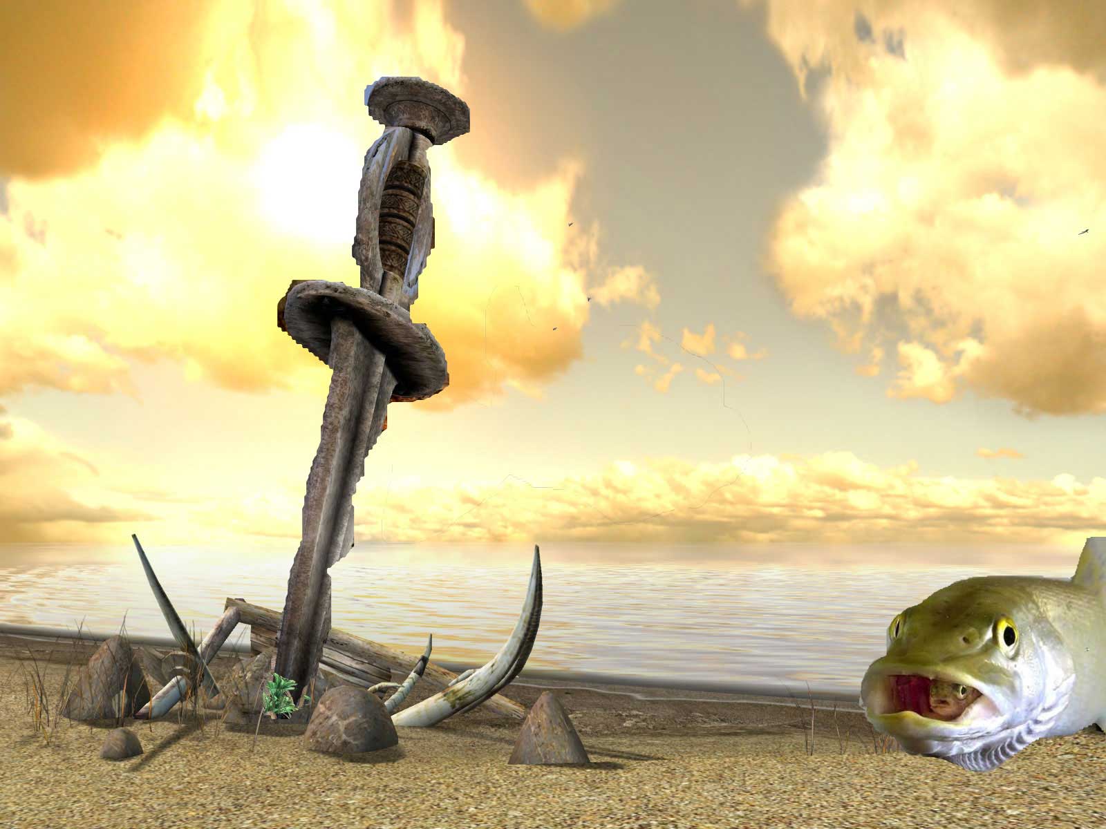 Tatsächlich scheint das Messer erst den Fisch erlegt zu haben und dann stecken geblieben zu sein. Naja, der Fisch "wirft" ja gerade einen Nachkommen und somit ist die Fisch-Population in Noloben ja gesichert! ;)