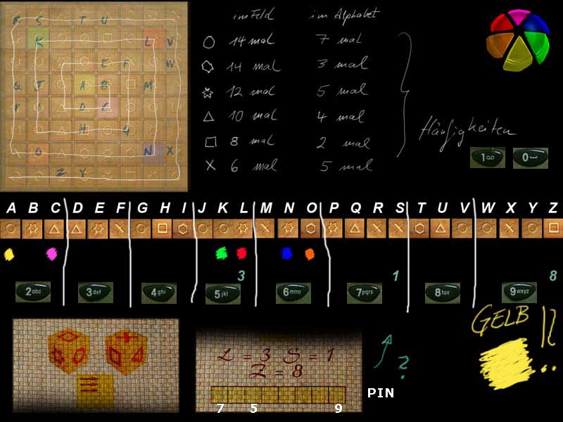 Ich glaube, die Häufigkeiten der Symbole sind nicht so relevant. Die Reihenfolge der PIN muss über den Würfel rauszufinden sein. 3 Ziffern haben wir ja schon. Tüftel.... :kratzen: