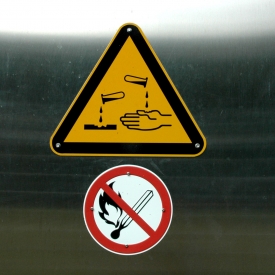 - Warnschild wg. ätzender Flüssigkeiten /Verbotsschild für offenes Feuer