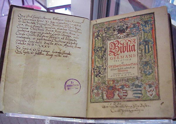 Bei der Bibel: das Bild auf der rechten Seite trägt die Jahreszahl 1565 während direkt darunter 1585 steht. Der Text auf der linken Seite zeigt auch die Jahreszahl 1585. Mit "Bibel" und "1585" find ich aber nix vernünftiges.