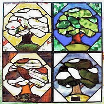 Viertes Bild: Ein Glasfenster mit den vier Jahreszeiten (beliebtes Baummotig ;-)). Das Fenster ist aufgeteilt in vier Bildern mit vier Teilen...