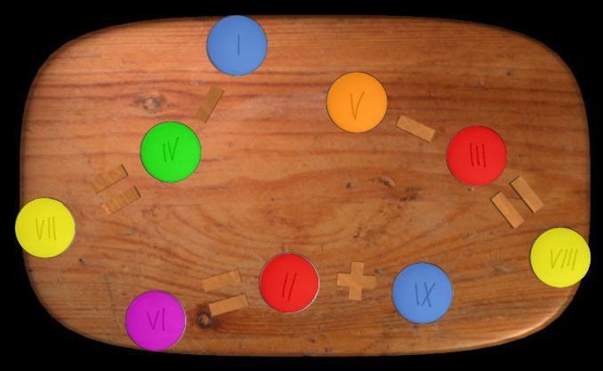 Der nächste super gute Ansatz, der mich in die richtige Richtung geschubst hat, kam von Quin. Quin hat nämlich entdeckt, dass wenn man auf dem Brett mit den römischen Ziffern die passenden Farben der Magnetbuchstaben des Wortes "Oldenburg" einsortiert, sich drei korrekte Formeln der Farblehre ergeben und zwar
