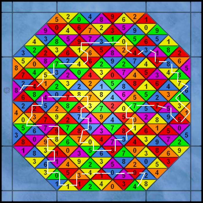 Auffällig ist nun, dass exakt diese Farben auch auf dem Mosaik vorkommen. Deshalb bin ich nun nach dem Prinzip dieser Farbengleichungen über das Mosaik maschiert. Mal von den diversen Fehlversuchen abgesehen... :roll: poste ich hier nun ein Bild, was die entsprechenden Felder verknüpft.