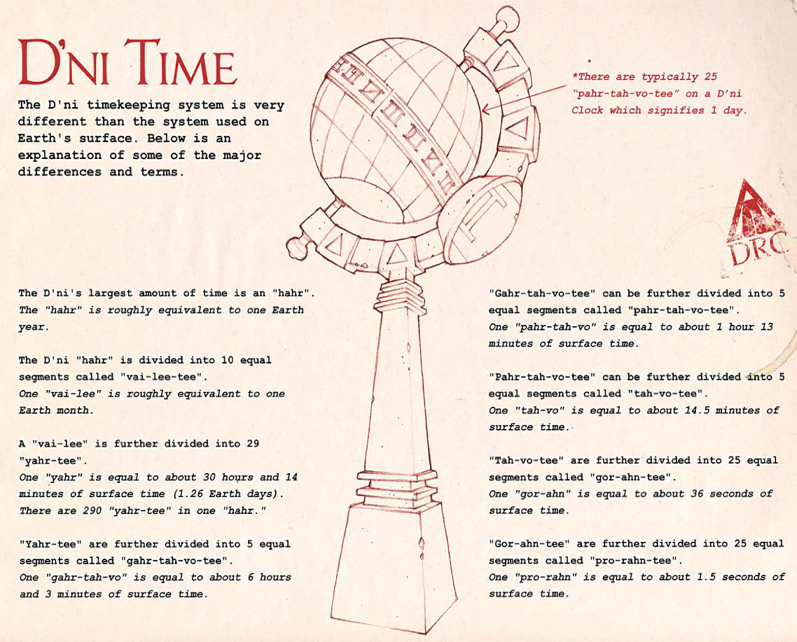 Die D'ni Zeitmessung weicht erheblich von dem System welches wir auf der Oberfläche benutzen ab. Hier sind ein paar der Begriff und Unterschiede erklärt: