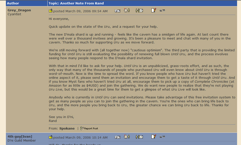 Um es kurz zu machen: Er bittet alle, die jetzt in UU sind, Einladungen an Freunde und Bekannte zu schicken mittels des Gratis Einladungstools. Es geht darum, soviele Spieler wie möglich zu mobilisieren, damit die jetzigen Geldgeber das Interesse nicht verlieren und sehen, dass die Uru Gemeinde es ernst meint und Uru Live wieder zurück haben will. Das geht aber nur mit einer grossen Anzahl an Interessierten.