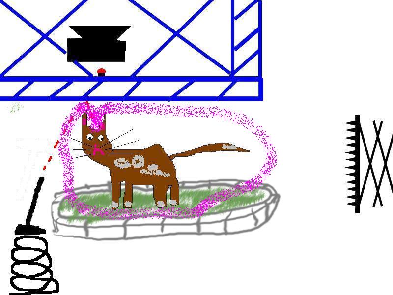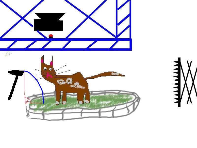 Der Stahlträger nützt nix, weil der Amboss auf einen roten Schalter fällt, welcher das Nagelbrett rechts, auf die Katze zu schleudert!