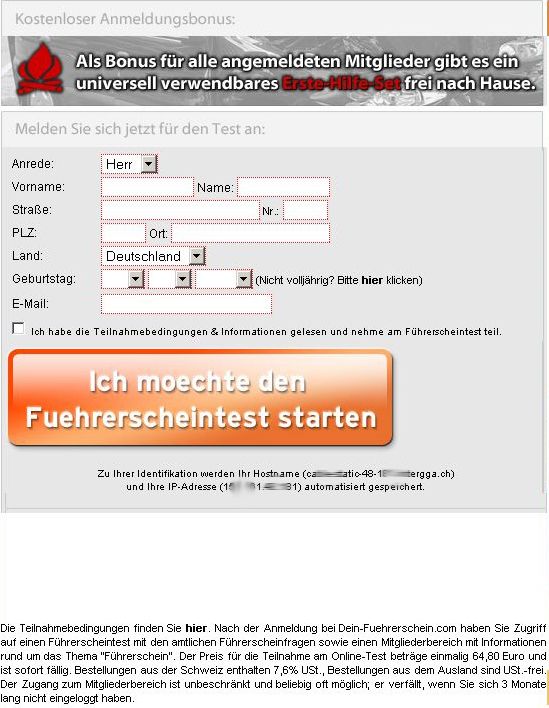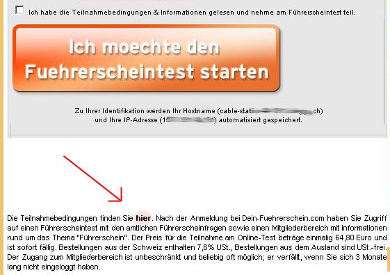 Man beachte, dass SEEEEEEEHR gross ein Führerscheintest angeboten wird, erst nach runterscrollen kann man unten im (kleingeschriebenen) Fliesstext den Link [url=http:/ /www .dein-fuehrerschein .com/content.php?p=agb]hier[/url] erkennen!