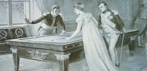 Ab dem Mittelalter galt Billard als exklusive Freizeit-Beschäftigung der Kaiser und Könige. An allen großen Höfen Europas gab es ab dem 16. Jahrhundert Billardtische. Aus dem französischen ."Bille" (= Ball ) und dem engl. "Jard" (= Stock,Rute) wurde die noch heute gebräuchliche Schreibweise "Billard". Auf meinem nachgestellten Lösungsbild ist Napoleon beim Billardspiel mit Maria Luise von Österreich zu sehen. Da die Monarchen Trendsetter ihrer Zeit waren, stand das Billardspiel beim Adel und der gesamten gehobenen Gesellschaft hoch im Kurs.