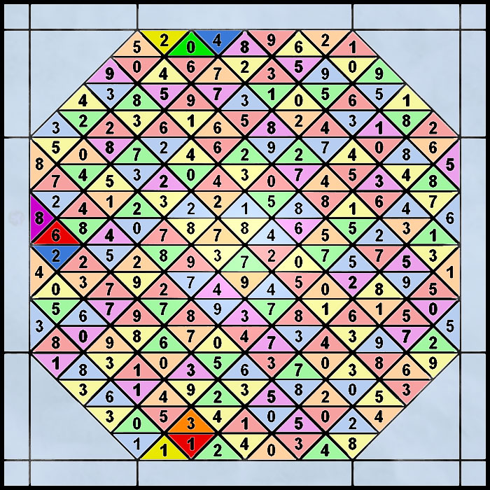 Ich habe die Kreise auf dem Brett einmal farblich angepaßt, das ganze Brett um 90 Grad gedreht und versucht einen Zusammenhang bzw. Hinweis zum Mosaikrätsel zu finden.