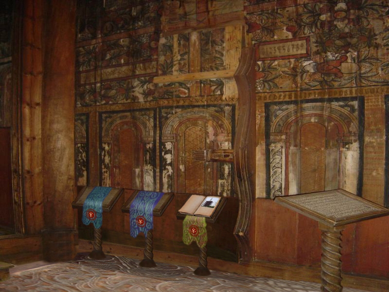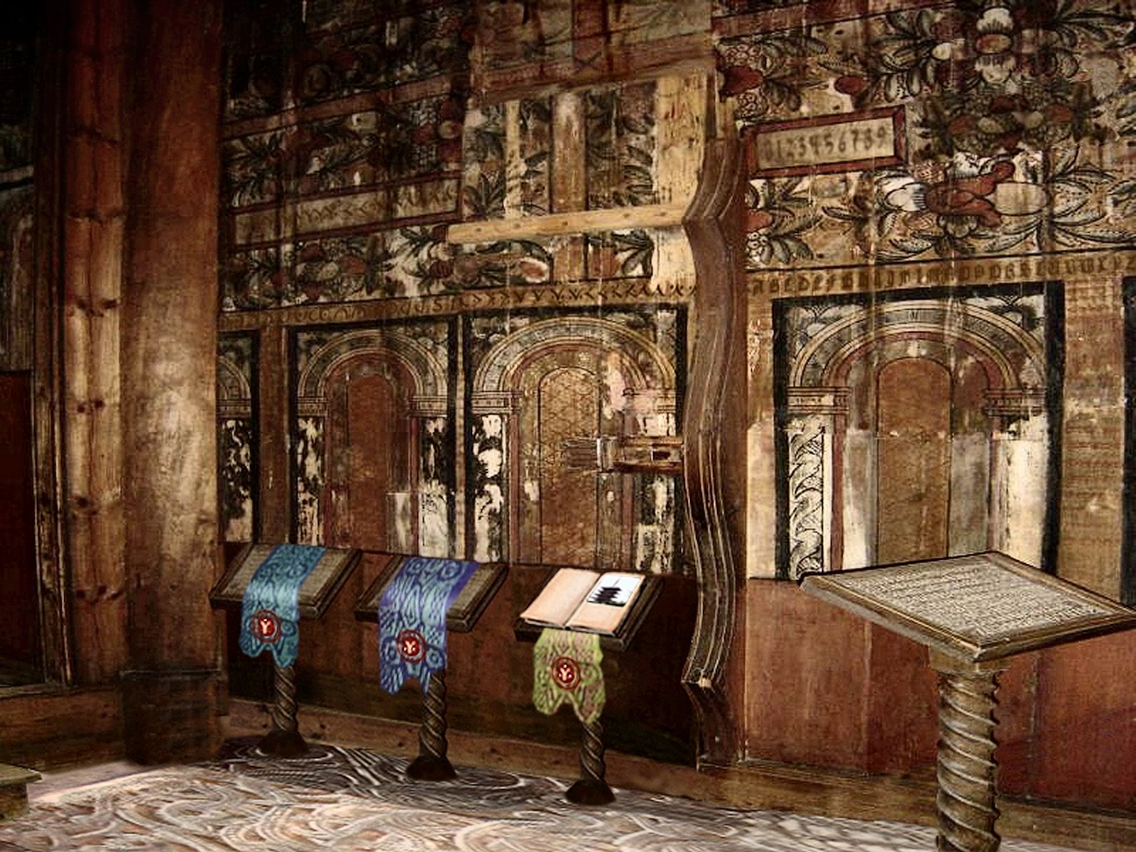 Im runden Bereich des Raumes sind hinten an der Wand D'ni-Schriftzeichen zu erahnen, oben am Deckenansatz Zahlen, darunter Buchstaben - vermutlich auch in der üblichen Reihenfolge, aber nicht wirklich zu erkennen. Die Zahlen beginnen jedenfalls in der Mitte mit 2,3,4, nicht bereits links.